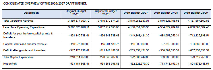 A stark funding gap The draft budget projects operating revenue of R3.819 billion against operating expenditure of R4.169 billion — an operating deficit of about R349 million. Including capital, the municipality faces an overall deficit of R432 million. These shortfalls come alongside a reduced capital programme of R192.9 million for 2026/27, down by R27.6 million from the adjusted 2025/26 budget, constraining investment in infrastructure at a time when maintenance and upgrades are critical.