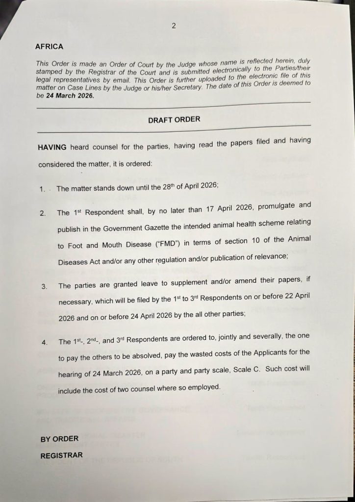 The court order and accompanying cost order in the urgent legal case brought by Saai, Sakeliga and Free State Agriculture against the Minister, Director-General and Director of Animal Health of the Department of Agriculture, regarding the control of foot-and-mouth disease vaccine, have once again highlighted how far removed the bureaucratic world of the public service is from the seriousness and urgency of livestock farming. While more farms are financially collapsing every day, the Minister, after three months, brought a draft framework for action (an Article 10 vaccination scheme) to court as his solution—one that had been rejected by his own department a week earlier. The current outbreak has been a major threat since 2022/2023, yet the Minister could only present a draft minutes before the hearing.