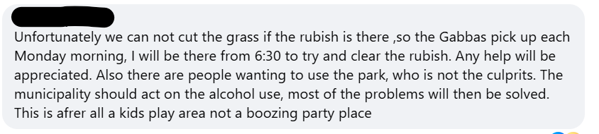 The recent comments regarding the state of the park following recent functions highlight a growing concern among community members about cleanliness and responsibility. Many expressed frustration over the littering and neglect that have turned what should be a welcoming area for families into a troubled, messy environment. Suggestions include holding those responsible accountable, with a strong call for the municipality to regulate alcohol use to prevent rowdy behaviour that contributes to the mess. Community volunteers are stepping up to help clean up, showing great civic spirit, but long-term solutions are essential. Increased patrols and consistent clean-up efforts could foster communal respect for the park, ensuring it remains a safe and enjoyable space for everyone.